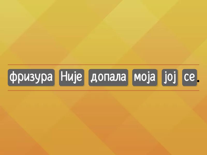 Није јој се допала моја фризура., Питао је да ли може да позајми нову оловку., Тетка ми је за рођендан поклонила лабело., Ишла сам у биоскоп са најбољом другарицом и гледале смо филм о Барби., Ја сам провела Божић са породицом., Мој тата ми је летос купио књигу.,