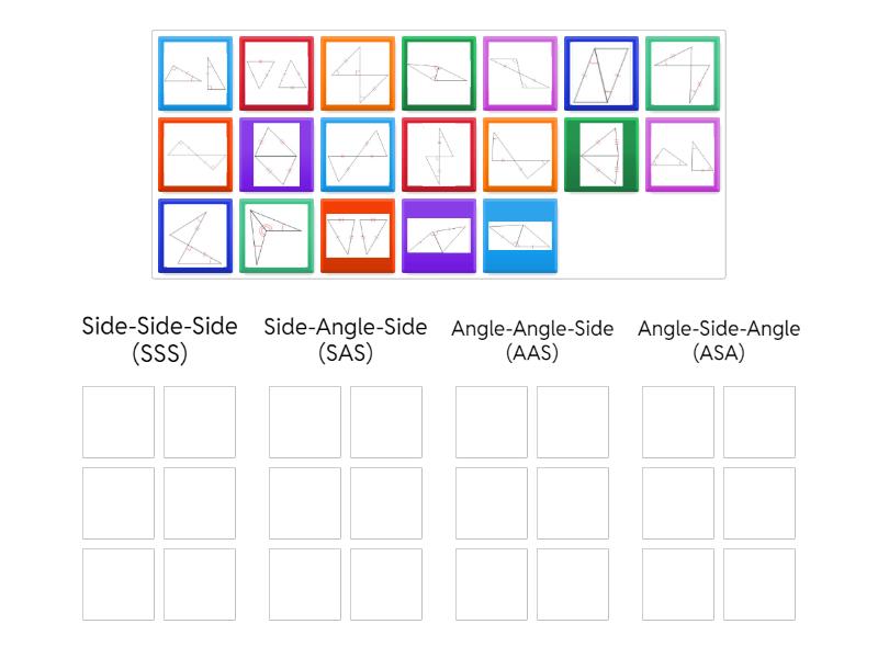 Side-Side-Side (SSS): , , , , Side-Angle-Side (SAS): , , , , Angle-Angle-Side (AAS): , , , , , , Angle-Side-Angle (ASA): , , , , ,