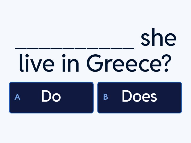 1) __________ she live in Greece? a) Do b) Does 2) __________ you have a brother? a) Do b) Does 3) __________ he like fast cars? a) Do b) Does 4) __________ you know my fried Sally? a) Do b) Does 5) __________ they study English every evening? a) Do b) Does 6) __________ she like you? a) Do b) Does 7) __________ he speak Spanish? a) Do b) Does 8) __________ your dog have a name? a) Do b) Does 9) __________ I need to study hard? a) Do b) Does 10) __________ they live in Athens? a) Do b) Does