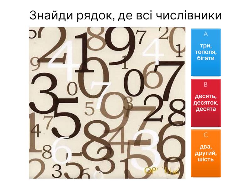 1) Знайди рядок, де всі числівники a) три, тополя, бігати b) десять, десяток, десята c) два, другий, шість 2) Числівником є слово... a) п'ятизірковий b) двадцятка c) другорядний d) вісім 3) Порядковим є числівник a) півтора b) три c) п'ятеро d) дев'ятий 4) Знайдіть числівник в реченні: Краще на п'ять хвилин раніше, ніж на хвилину пізніше. a) п'ять b) краще c) хвилин d) раніше 5) Котра година на малюнку? a) чверть на дев'яту b) чверть на восьму c) за п'ятнадцять хвилин дев'ята  d) без п'ятнадцяти вісім