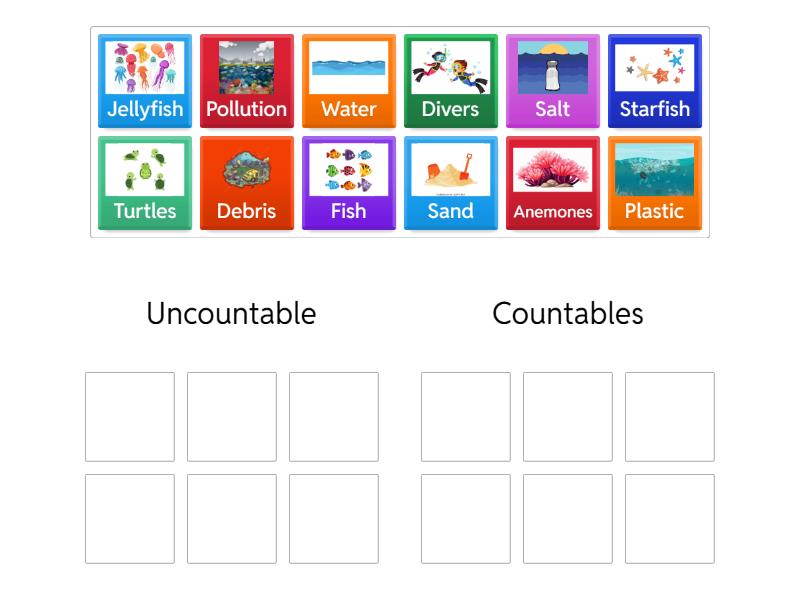 Uncountable: Debris, Sand, Pollution, Salt, Water, Plastic, Countables: Jellyfish, Anemones, Divers, Fish, Starfish, Turtles,