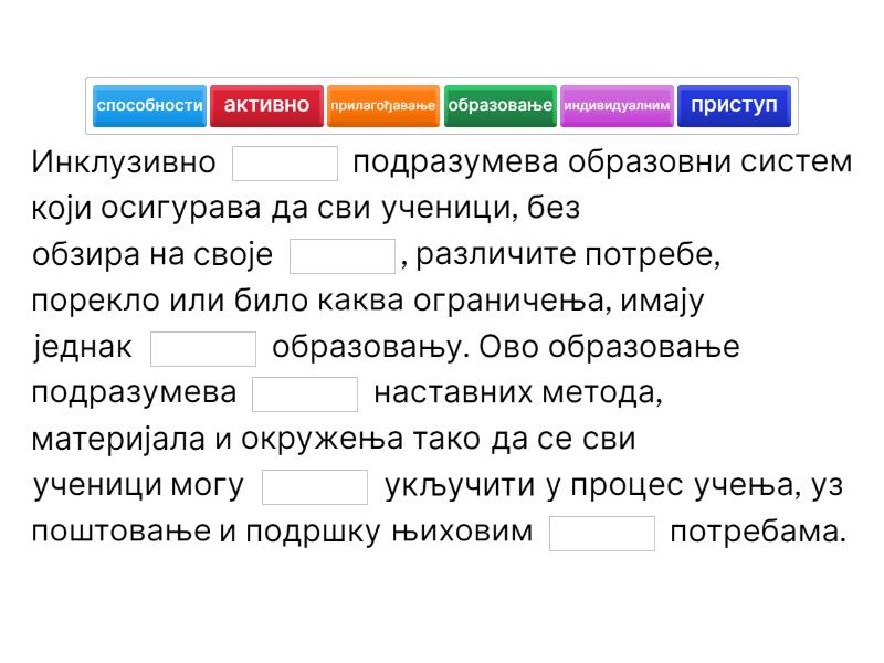 Инклузивно ____ подразумева образовни систем који осигурава да сви ученици, без обзира на своје ____, различите потребе, порекло или било каква ограничења, имају једнак ____ образовању. Ово образовање подразумева ____ наставних метода, материјала и окружења тако да се сви ученици могу ____ укључити у процес учења, уз поштовање и подршку њиховим ____ потребама.
