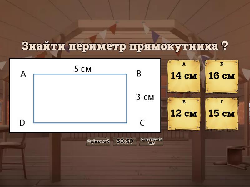 1) Знайти периметр прямокутника ? a) 14 см b) 16 см c) 12 см d) 15 см 2) Який периметр квадрата зі сторонами по 4 см? Обчисли. a) 16 см b) 8 см c) 12 см d) 10 см 3) Обчисліть периметр квадрата зі стороною 7см. a) 26см b) 14см c) 28см d) 22 см 4) Що таке периметр многокутника? a) добуток довжин усіх його сторін b) сума довжин усіх його сторін. c) різниця довжин усіх його сторін. 5) Знайди периметр чотирикутника ? a) 18 см b) 16 см c) 24 см d) 26 см 6) Знайти периметр прямокутника ? a) 16 см b) 20 см c) 34 см d) 32 см 7) Знайди периметр чотирикутника ? a) 24 см b) 16 см c) 28 см d) 30 см 8) Знайти периметр прямокутника ? a) 26 дм b) 34 дм c) 44 дм d) 42 дм 9) Знайти периметр квадрата ? a) 80 см b) 90 см c) 70 см d) 60 см 10) Знайти периметр трикутника ? a) 13 b) 16 c) 11 d) 14 11)  Знайти периметр прямокутника ? a) 11 см b) 9 см c) 18 см d) 14 см 12) Знайти периметр трикутника ? a) 12 b) 13 c) 8 d) 14