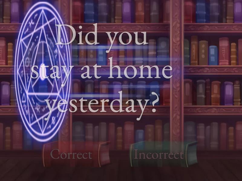 Correct: Did you stay at home yesterday?, She wasn't happy last night., We played hockey last winter., I was late for school yesterday., He couldn't swim when he was 5., We didn't sing songs last week., He had to come home early yesterday., My family could travel a lot before., Why did you eat all the biscuits?, Where did you come from?, Who could swim at the age of 4?, Incorrect: Did you be at home yesterday?, She didn't be happy last night., She were at school two days ago., We have played hockey last winter., He didn't can to swim when he was 5., She musted go home yesterday., They didn't had to pay for their lunch., She goed to school late yesterday., We didn't went to the funfair last year., Who did came with you?, My friend just took my book home., Why did you can cook so well?,