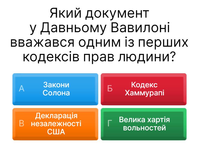 1) Який документ у Давньому Вавилоні вважався одним із перших кодексів прав людини? a) Закони Солона b) Кодекс Хаммурапі c) Декларація незалежності США d) Велика хартія вольностей 2) Який принцип проголошувала Велика хартія вольностей (1215 р.)? a) Рівність усіх перед Богом b) Обмеження влади короля c) Суверенітет народу d) Право на працю 3) Який філософ розробив ідеї природного права та свободи? a) Арістотель b) Руссо c) Вольтер d) Джон Локк 4) Яка подія ХХ століття стала ключовою для інституалізації прав людини? a) Прийняття Статуту Ліги Націй b) Створення ООН c) Прийняття Загальної декларації прав людини d) Прийняття Конституції США 5) Яке право входить до особистих прав людини? a) Право на освіту b) Право на працю c) Право на свободу слова d) Право на життя 6) Що є прикладом політичного права? a) Право на медичну допомогу. b) Право на власність c) Право на участь у виборах d) Право на рівність перед законом 7) Яке соціальне право порушено, якщо людина не може отримати освіту? a) Право на працю b) Право на освіту c) Право на соціальний захист d) Право на охорону здоров’я. 8) Яке культурне право забезпечує збереження національної ідентичності? a) Право на свободу творчості. b) Право на збереження культурної ідентичності. c) Право на доступ до культурних цінностей. d) Право на екологічну освіту. 9) Яке екологічне право порушено, якщо влада приховує інформацію про забруднення? a) Право на безпечне довкілля b) Право на доступ до екологічної інформації. c) Право на участь у прийнятті екологічних рішень d) Право на соціальний захист. 10) Що означає принцип єдності прав і обов’язків? a) Кожне право передбачає відповідний обов’язок. b) Обов’язки не впливають на реалізацію прав. c) Права гарантуються лише за виконання всіх обов’язків. d) Права важливіші за обов’язки.