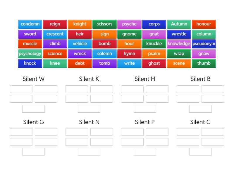 Silent W: sword, wrestle, wreck, wrap, write, Silent K: knight, knee, knock, knuckle, knowledge, Silent H: vehicle, ghost, hour, heir, honour, Silent B: tomb, climb, thumb, bomb, debt, Silent G: gnome, gnat, gnaw, reign, sign, Silent N: hymn, solemn, column, Autumn, condemn, Silent P: psalm, psychology, psyche, pseudonym, corps, Silent C: muscle, scissors, science, crescent, scene,