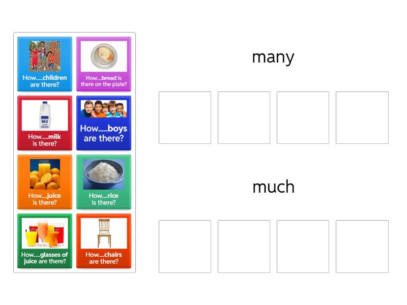 many: How.....glasses of juice are there?, How.....boys are there?, How.....children are there?, How....chairs are there?, much: How.....milk is there?, How....rice is there?, How....juice is there?, How....bread is there on the plate?,