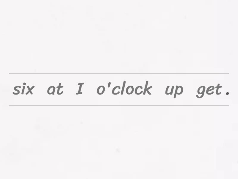 I get up at six o'clock., I go to school at seven o'clock. , I eat a sandwich at ten o'clock., I go home at one o'clock., I do my homework at four o'clock. , I have a shower at eight o'clock. , I brush my teeth at half past six., I go to sleep at nine o'clock., I play with my brother at five o'clock. , I get dressed in the morning. ,