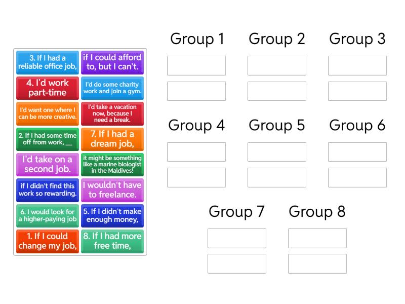 Group 1: 1. If I could change my job,, I’d want one where I can be more creative., Group 2: 2. If I had some time off from work, __, I’d take a vacation now, because I need a break., Group 3: 3. If I had a reliable office job,, I wouldn’t have to freelance., Group 4: 4. I’d work part-time, if I could afford to, but I can’t., Group 5: 5. If I didn’t make enough money,, I’d take on a second job., Group 6: 6. I would look for a higher-paying job, if I didn’t find this work so rewarding., Group 7: 7. If I had a dream job,, it might be something like a marine biologist in the Maldives!, Group 8: 8. If I had more free time,, I’d do some charity work and join a gym.,