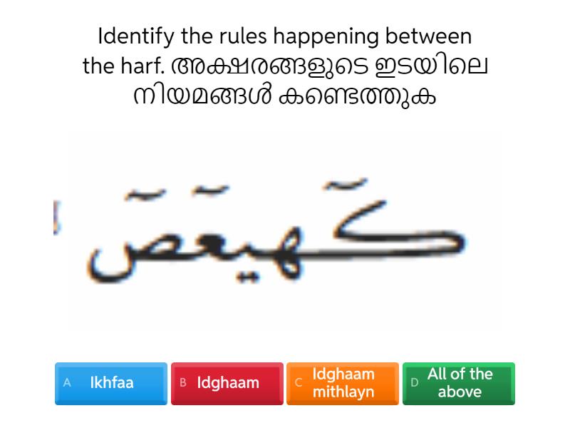 1) Identify the rules happening between the harf.  അക്ഷരങ്ങളുടെ ഇടയിലെ നിയമങ്ങൾ കണ്ടെത്തുക a) Ikhfaa b) Idghaam c) Idghaam mithlayn d) All of the above 2) Find the sound level of the given word. നൽകിയിരിക്കുന്ന വാക്കിൻ്റെ ശബ്ദ നില കണ്ടെത്തുക a) 36-3-311-336-32 b) 36-111-336-32 c) 36-3-111-336-32 d) 36-311-336-32 3) While stopping on the above word, which of the following madd are used ? മുകളിലത്തെ വാക്കിൽ നിർത്തുമ്പോൾ, തായെ കൊടുത്തിട്ടുള്ള ഏതൊക്കെ മദ്ദാണു ഉപയോഗിക്കുന്നത്? a) Madd Aaridh lilsukoon b) Madd Lazim Kalimi Mussaqqal c) Madd Lazim Kalimi Mukhaffaf d) A and B 4) The sharpness of the sound of the letter that flows through a tight passage causes …………. ഇറുകിയ വഴിയിലൂടെ ഒഴുകുന്ന അക്ഷരത്തിന്റെ ശബ്ദത്തിന് മൂർച്ച കാരണമുണ്ടകുന്നത് ………….. a) Drifting b) Spreading c) Whistling d) Easiness 5) Identify the rules in the following verse. പിന്തുടരുന്ന ആയത്തിൽ ഏതൊക്കെ നിയമങ്ങളാണുള്ളത്. a) Madd Lazim Harafi Mukhaffaf and Idghaam bi ghunnah b) Madd Lazim Harafi Mukhaffaf and exception of Idghaam bi ghunnah c) Madd Lazim Kalimi Mussaqqal and of Idghaam bi ghunnah d) Madd Lazim Kalimi Mukhaffaf and exception of Idghaam bi ghunnah 6) Pick the one with highest level of gunnah from the words given below. താഴെ കൊടുത്തിരിക്കുന്ന വാക്കുകളിൽ നിന്ന് ഏറ്റവും ഉയർന്ന തലത്തിലുള്ള ഘുന്നാ a) a and b b) a and d c) a and c d) b and d 7) Identify the secondary madd in the given verse.  തന്നിരിക്കുന്ന വചനത്തിലെ സെക്കൻഡറി മദ് കണ്ടെത്തുക a) madd lazim harafi mussaqqal b) madd lazim kalimi mussaqqal c) madd lazim harafi mukhaffaf d) both A and C 8) Which madds are there in this verse? ഈ വാക്യത്തിലുള്ള മദ്ദുകൾ ഏതൊക്കെയാണ്?  a) madd ewadh,madd wajib muthasil b) madd leen,madd sila sughra c) madd leen,madd sila kubra d) madd jaiz munfasil,madd badal 9) Find out the odd one. ഒറ്റപ്പെട്ടത് കണ്ടെത്തുക. a) b) c) d) 10) Identify the secondary madd in this verse. മുകളിലത്തെ വാക്യത്തിലെ സെക്കന്ററി മദ് തിരിച്ചറിയുക. a) المد الواجب المتصل and المد اللازم الكلِمي المُخفَّف b) المد الواجب المتصل and المد اللازم الكلِمي المثقل c) المد اللازم الكلِمي المُخفَّف and المد جائز منفصل d) المد اللازم الكلمي المثقل and المد جائز منفصل 11) Identify the rule of meem sakinah in this verse. ഈ വാക്യത്തിൽ തന്നിട്ടുള്ള മീം സാക്കിനെയുടെ നിയമം കണ്ടെത്തുക. a) Ikhfaa’ Shafawi b) Idghaam Al mithlayn c) Idhaar As-Shafawi d) Idhaar Muthalaq 12) Identify the madd in this verse.  ഈ ആയത്തിലെ മദ്ദിനെ കണ്ടെത്തുക. a) المد الأصلي and المد اللين b) المد العوض and المد اللازم c) المد الأصلي and المد العارض للسكون d) المد الأصلي and المد البدل 13) The Strength of qalqala in this word is…… ഈ വാക്കിലെ ഖൽഖലയുടെ ശക്തി…… ആണ്. a) قَلْقَلة عُظمَة b) قَلْقَلة كُبْرى c) قَلْقَلة صُغْرَى 14) Identify the madds in the following word. താഴെ കൊടുത്തിട്ടുള്ള വാക്കിലെ മദ്ദുകൾ തിരിച്ചറിയുക a) madd lazim kalimi mussaqqal and madd aridh lil sukoon b) madd lazim kalimi mukhaffaf and madd leen c) madd lazim harfi mussaqqal and madd aridh lil sukoon d) madd lazim kalimi mussaqqal and madd leen 15) Identify the madd. മദ് തിരിച്ചറിയുക. a) madd badal b) madd tabiee c) madd evadh d) None of the above 16) Out of these three, which has Madd Lazim Harfi Mussaqqal? താഴെ കൊടുത്തിട്ടുള്ള മൂന്നെണ്ണത്തിൽ, മദ് ലാസിം ഹർഫി മുസക്കൽ ഏതാണ്? a) a b) b c) c d) None of the above 17) The following words are examples of ………madd. പിന്തുടരുന്ന വാക്കുകൾ………..മദ്ദിന്റെ ഉദാഹരണങ്ങളാണ്. a) المد اللازم الكلمي b) المد اللازم الحرفي c) المد الواجب المتصل d) Both A and B 18) The following word is the only one example of madd lazim kalimi mussaqqal in the Holy Quran. താഴെ കൊടുത്തിട്ടുള്ള വാക്ക് ഖുറാൻ ഇല്‍ ഉള്ള മദ്ദ് ലാസിം കാലമി മുസകൾ ന്റെ ഒരേയൊരു ഉദാഹരണം ആണ്‌. a) True b) False