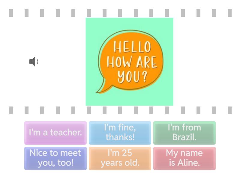 I’m fine, thanks!, My name is Aline. - What's your name?, I'm 25 years old. - How old are you?, I'm from Brazil. - Where are you from?, I'm a teacher. - What do you do?, Nice to meet you, too! - Nice to meet you.,