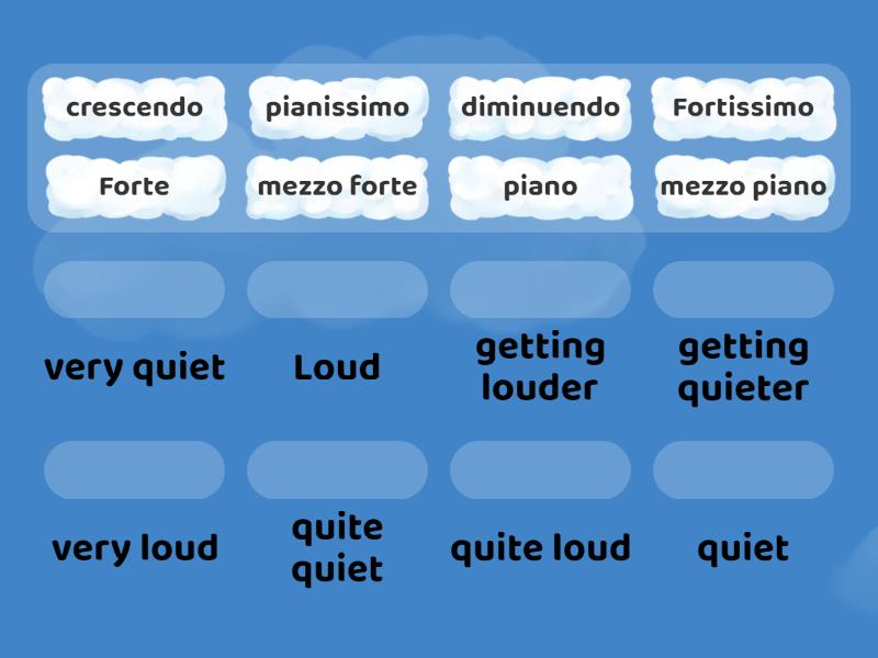 Forte - Loud, Fortissimo - very loud, mezzo forte - quite loud, piano - quiet, mezzo piano - quite quiet, pianissimo - very quiet, crescendo - getting louder, diminuendo - getting quieter,