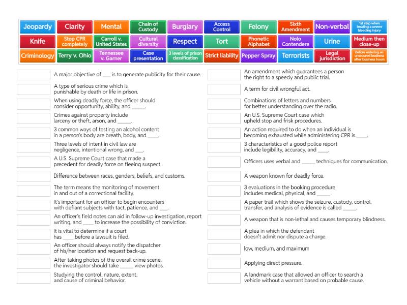 Tennessee v. Garner - A U.S. Supreme Court case that made a precedent for deadly force on fleeing suspect., Strict liability - Three levels of intent in civil law are negligence, intentional wrong, and ___. , Terrorists - A major objective of ___ is to generate publicity for their cause. , Cultural diversity - Difference between races, genders, beliefs, and customs. , Felony - A type of serious crime which is punishable by death or life in prison. , 1st step when treating a severe bleeding injury - Applying direct pressure. , Legal jurisdiction - It is vital to determine if a court has ____ before a lawsuit is filed. , Nolo Contendere - A plea in which the defendant doesn't admit nor dispute a charge. , 3 levels of prison classification - low, medium, and maximum, Criminology - Studying the control, nature, extent, and cause of criminal behavior. , Mental - 3 evaluations in the booking procedure includes medical, physical, and _____ ., Non-verbal - Officers uses verbal and _____ techniques for communication., Medium then close-up - After taking photos of the overall crime scene, the investigator should take _____ view photos. , Chain of Custody - A paper trail which shows the seizure, custody, control, transfer, and analysis of evidence is called _____., Terry v. Ohio - An U.S. Supreme Court case which upheld stop and frisk procedures. , Knife - A weapon known for deadly force. , Pepper Spray - A weapon that is non-lethal and causes temporary blindness., Sixth Amendment - An amendment which guarantees a person the right to a speedy and public trial., Burglary - Crimes against property include larceny or theft, arson, and _____., Tort - A term for civil wrongful act. , Carroll v. United States - A landmark case that allowed an officer to search a vehicle without a warrant based on probable cause., Urine - 3 common ways of testing an alcohol content in a person's body are breath, body, and ____., Phonetic Alphabet - Combinations of letters and numbers for better understanding over the radio. , Stop CPR completely - An action required to do when an individual is becoming exhausted while administering CPR is ____. , Jeopardy - When using deadly force, the officer should consider opportunity, ability, and _____., Clarity - 3 characteristics of a good police report include legibility, accuracy, and ____., Case presentation - An officer's field notes can aid in follow-up investigation, report writing, and ____ to increase the possibility of conviction., Access Control - The term means the monitoring of movement in and out of a correctional facility. , Before entering an unsecured business after business hours - An officer should always notify the dispatcher of his/her location and request back-up., Respect - It's important for an officer to begin encounters with defiant subjects with tact, patience, and ___.,