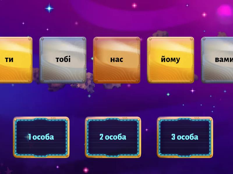 1 особа: я, мене, ми, нас, мені, нам, 2 особа: ти, ви, тобі, тобою, вам, вами, 3 особа: він, його, йому, вона, їй, вони, ними, їх,