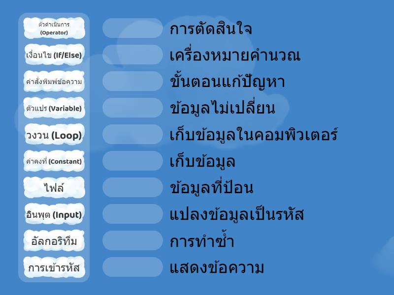 อัลกอริทึม - ขั้นตอนแก้ปัญหา, วงวน (Loop) - การทำซ้ำ, เงื่อนไข (If/Else) - การตัดสินใจ, ตัวแปร (Variable) - เก็บข้อมูล, การเข้ารหัส - แปลงข้อมูลเป็นรหัส, คำสั่งพิมพ์ข้อความ - แสดงข้อความ, ค่าคงที่ (Constant) - ข้อมูลไม่เปลี่ยน, อินพุต (Input) - ข้อมูลที่ป้อน, ตัวดำเนินการ (Operator) - เครื่องหมายคำนวณ, ไฟล์ - เก็บข้อมูลในคอมพิวเตอร์,