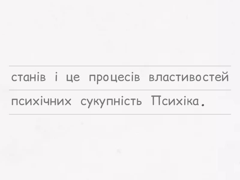 Психіка це сукупність психічних процесів станів і властивостей., Мотивація це внутрішній стан який спонукає людину до дій., Психологія це наука що вивчає поведінку психіку та свідомість людини., Особистість це система соціальної і психологічних характеристик людини., Стрес це реакція організму на складні або небезпечні ситуації.,