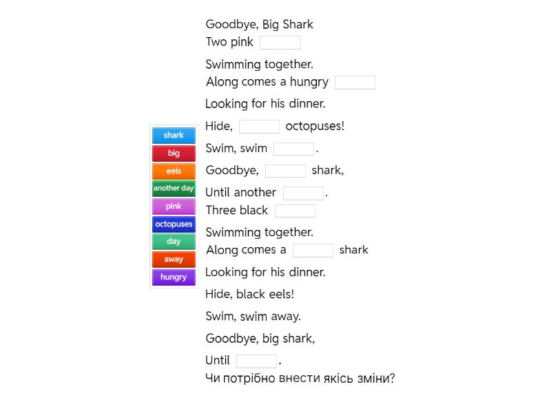 Goodbye, Big Shark Two pink ____ Swimming together. Along comes a hungry ____ Looking for his dinner. Hide, ____ octopuses! Swim, swim ____. Goodbye, ____ shark, Until another ____. Three black ____ Swimming together. Along comes a ____ shark Looking for his dinner. Hide, black eels! Swim, swim away. Goodbye, big shark, Until ____. Чи потрібно внести якісь зміни?