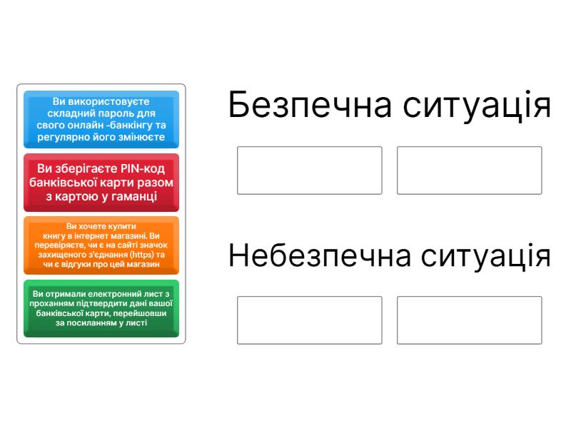 Безпечна ситуація: Ви хочете купити книгу в інтернет магазині. Ви перевіряєте, чи є на сайті значок захищеного з'єднання (https) та чи є відгуки про цей магазин, Ви використовуєте складний пароль для свого онлайн -банкінгу та регулярно його змінюєте, Небезпечна ситуація: Ви отримали електронний лист з проханням підтвердити дані вашої банківської карти, перейшовши за посиланням у листі, Ви зберігаєте PIN-код банківської карти разом з картою у гаманці,
