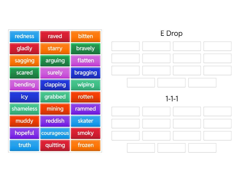 E Drop: scared, mining, shameless, hopeful, truth, arguing, wiping, surely, skater, smoky, courageous, bravely, icy, frozen, raved, 1-1-1: clapping, rammed, muddy, quitting, redness, reddish, bending, starry, sagging, flatten, gladly, rotten, grabbed, bragging, bitten,