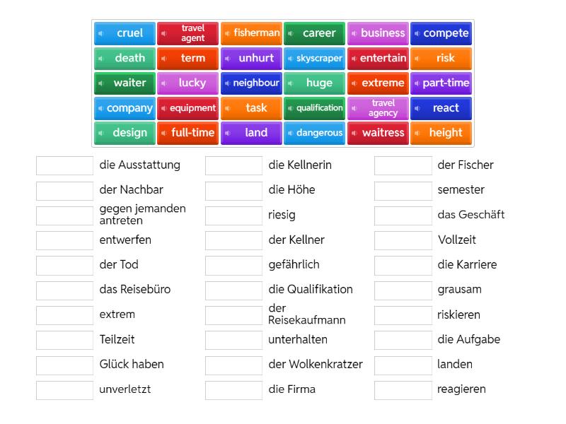 travel agency - das Reisebüro, travel agent - der Reisekaufmann, waiter - der Kellner, waitress - die Kellnerin, neighbour - der Nachbar, cruel - grausam, dangerous - gefährlich, death - der Tod, entertain - unterhalten, equipment - die Ausstattung, extreme - extrem, fisherman - der Fischer, height - die Höhe, huge - riesig, lucky - Glück haben, react - reagieren, risk - riskieren, skyscraper - der Wolkenkratzer, task - die Aufgabe, land - landen, unhurt - unverletzt, business - das Geschäft, career - die Karriere, company - die Firma, compete - gegen jemanden antreten, design - entwerfen, full-time - Vollzeit, part-time - Teilzeit, qualification - die Qualifikation, term - semester,