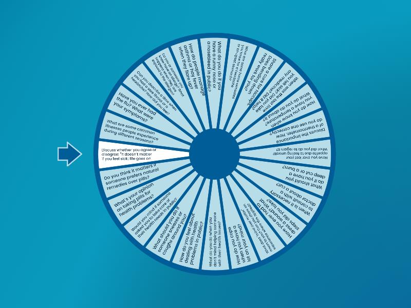 1) What are some common illnesses people experience during different seasons? 2) Have you ever had the flu? What were your symptoms? 3) Can you describe a time when you had a sore throat or a headache? How did you feel? 4) Do you or someone you know have an allergy? What happens when they are exposed to the allergen? 5) How do people manage asthma or hay fever when they flare up? 6) What do you do if you have a runny nose or a nosebleed in public? 7) What are some home remedies you know for a headache or an upset stomach? 8) Share a cure for hiccups. Does bending down really work for you? 9) When was the last time you felt sick? Did you take any medicine? Did it help? 10) How do you know when you have a temperature? What do you do about it? 11) Discuss the importance of a thermometer. How do you use one correctly? 12) Have you ever lost your appetite due to feeling unwell? What did you do to regain it? 13) What should you do if you have a deep cut or a burn? 14) When is it necessary to consult with a doctor about a cut? 15) Have you ever had to dress a wound? What steps did you take? 16) What does "mind over matter" mean to you? Can you share an experience where this applied? 17) How do you cope when you have a lot on your mind? 18) What do you do when you don’t mind helping someone with their health issues? 19) How do you feel about dealing with health problems in public? 20) What should you do if someone sneezes or coughs around you? 21) Would you mind if someone asked you to take care of their health needs in public? 22) What’s your opinion on taking pills for health problems? 23) Do you think it matters if someone prefers natural remedies over pills? 24) Discuss whether you agree or disagree: "It doesn’t matter if you feel sick; life goes on