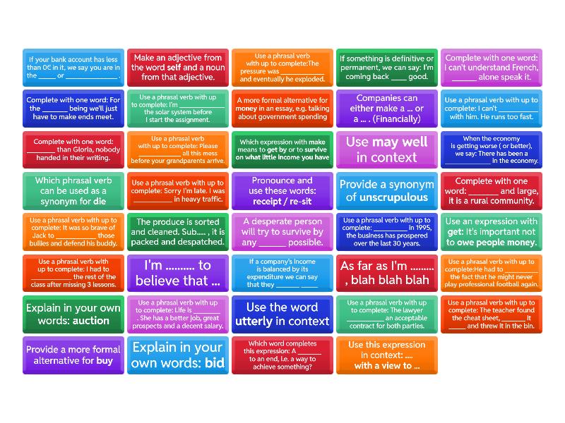 Which expression with make means to get by or to survive on what little income you have - to make ends meet, Which word completes this expression: A _______ to an end, i.e. a way to achieve something? - A means to an end, A desperate person will try to survive by any ______ possible. - means, Provide a synonym of unscrupulous - ruthless, Use the word utterly in context - That's utterly ridiculous. He felt utterly miserable. The two sisters are utterly different., Make an adjective from the word self and a noun from that adjective. - selfish and selfishness (selfless ... ), The produce is sorted and cleaned. Sub..... , it is packed and despatched. - subsequently, Use a phrasal verb with up to complete: It was so brave of Jack to ____________ those bullies and defend his buddy. - stand up to, Use a phrasal verb with up to complete:He had to __________ the fact that he might never play professional football again. - face up to, Use a phrasal verb with up to complete: __________ in 1995, the business has prospered over the last 30 years. - Set up, Use a phrasal verb with up to complete: I'm ______________ the solar system before I start the assignment. - reading up on, Use a phrasal verb with up to complete: The lawyer ___________ an acceptable contract for both parties. - drew up, Use a phrasal verb with up to complete: Please _____________ all this mess before your grandparents arrive. - clean up / clear up, Use a phrasal verb with up to complete: I can't ___________ with him. He runs too fast. - keep up with, Use a phrasal verb with up to complete: I had to ____________ the rest of the class after missing 3 lessons. - catch up with, Use a phrasal verb with up to complete: Life is ________ . She has a better job, great prospects and a decent salary. - looking up, Use a phrasal verb with up to complete:The pressure was _____________ and eventually he exploded. - building up, Use a phrasal verb with up to complete: The teacher found the cheat sheet, _______ it _____ and threw it in the bin. - tore it up (screwed it up), Which phrasal verb can be used as a synonym for die - pass away, Explain in your own words: auction - ..., Explain in your own words: bid - ..., Pronounce and use these words: receipt / re-sit, Provide a more formal alternative for buy - purchase, When the economy is getting worse ( or better), we say: There has been a ______________ in the economy. - downturn (upturn), Use a phrasal verb with up to complete: Sorry I'm late. I was ___________ in heavy traffic. - held up, Use an expression with get: It's important not to owe people money. - get into debt, Use this expression in context: .... with a view to ... - The government are raising taxes with a view to increasing public spending., Complete with one word: ________ than Gloria, nobody handed in their writing. - Other than, Complete with one word: I can't understand French, ______ alone speak it. - let alone, Complete with one word: _______ and large, it is a rural community. - By and large, Complete with one word: For the _______ being we'll just have to make ends meet. - For the time being, Use may well in context - He may well prove to be the worst President ever., If something is definitive or permanent, we can say: I'm coming back ____ good. - for good, Companies can either make a ... or a ... . (Financially) - profit or loss, If a company's income is balanced by its expenditure we can say that they _______ _____ - break even, If your bank account has less than 0€ in it, we say you are in the _____ or _______________ . - in the red overdrawn, A more formal alternative for money in an essay, e.g. talking about government spending - funds, I'm .......... to believe that ... - inclined, As far as I'm ......... , blah blah blah - concerned,