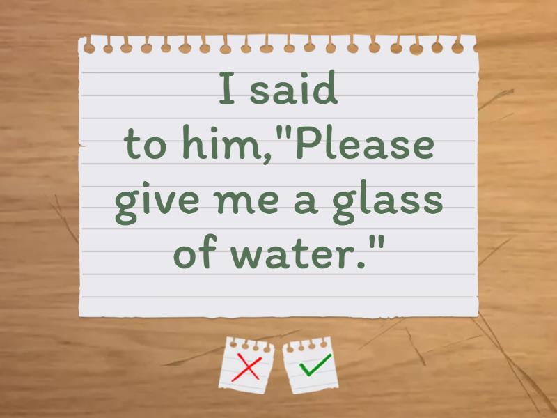 Suresh said,"I like dancing." - Suresh said that he liked dancing., Ravi said,"Honesty is the best policy." - Ravi said that Honesty is the best policy., She said,"I have done my homework." - She said that she had done her homework., I said to him,"Please give me a glass of water." - I requested him to give me a glass of water., The policeman said to the boy,"Show me your licence." - The policeman ordered the boy to show him licence., "How smart you are!" she said. - She exclaimed that he was very smart.,