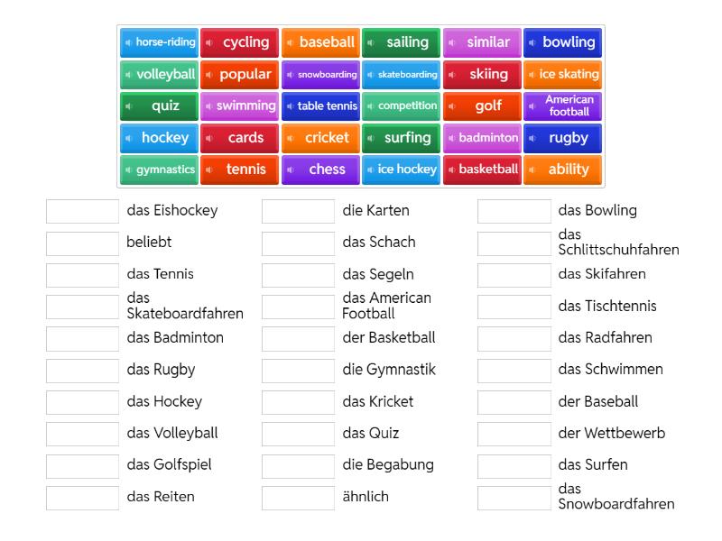 American football - das American Football, badminton - das Badminton, baseball - der Baseball, basketball - der Basketball, bowling - das Bowling, cards - die Karten, chess - das Schach, cricket - das Kricket, cycling - das Radfahren, golf - das Golfspiel, gymnastics - die Gymnastik, hockey - das Hockey, horse-riding - das Reiten, ice hockey - das Eishockey, ice skating - das Schlittschuhfahren, rugby - das Rugby, sailing - das Segeln, skateboarding - das Skateboardfahren, skiing - das Skifahren, snowboarding - das Snowboardfahren, surfing - das Surfen, swimming - das Schwimmen, table tennis - das Tischtennis, tennis - das Tennis, volleyball - das Volleyball, competition - der Wettbewerb, popular - beliebt, quiz - das Quiz, similar - ähnlich, ability - die Begabung,