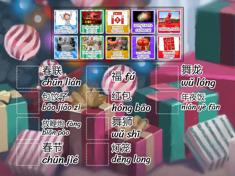 праздник весны - 春节 chūn jié, танец дракона - 舞龙 wǔ lóng, танец льва - 舞狮 wǔ shī , парные надписи - 春联 chūn lián, китайский фонарик - 灯笼 dēng long, счастье, благополучие - 福 fú, новогодний стол - 年夜饭 nián yè fàn, лепить пельмени - 包饺子 bāo jiǎo zi, красный конверт - 红包 hóng bāo, запускать салюты - 放鞭炮 fàng biān pào,