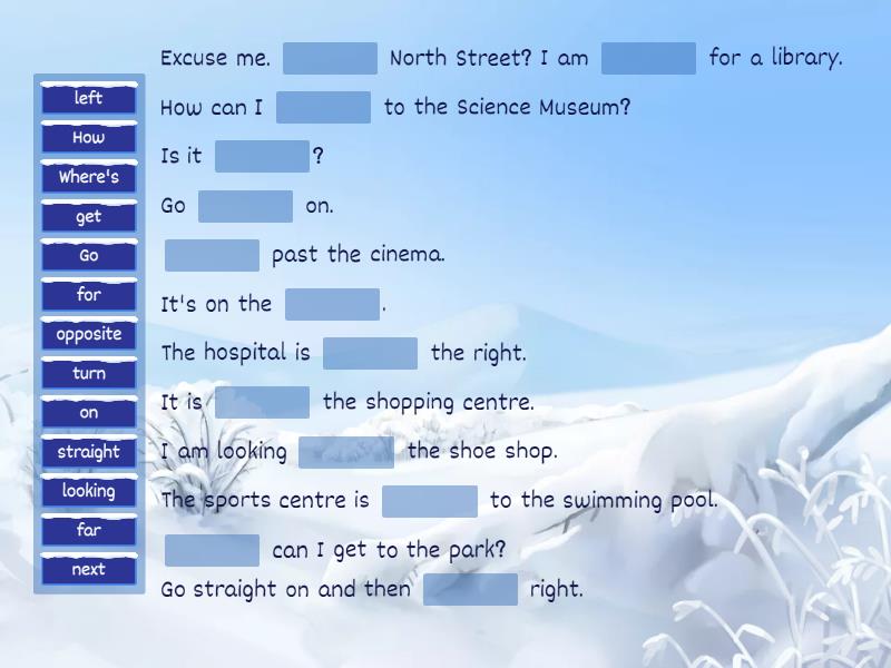 Excuse me. ____ North Street? I am ____ for a library. How can I ____ to the Science Museum? Is it ____? Go ____ on. ____ past the cinema. It's on the ____. The hospital is ____ the right. It is ____ the shopping centre. I am looking ____ the shoe shop. The sports centre is ____ to the swimming pool. ____ can I get to the park? Go straight on and then ____ right.