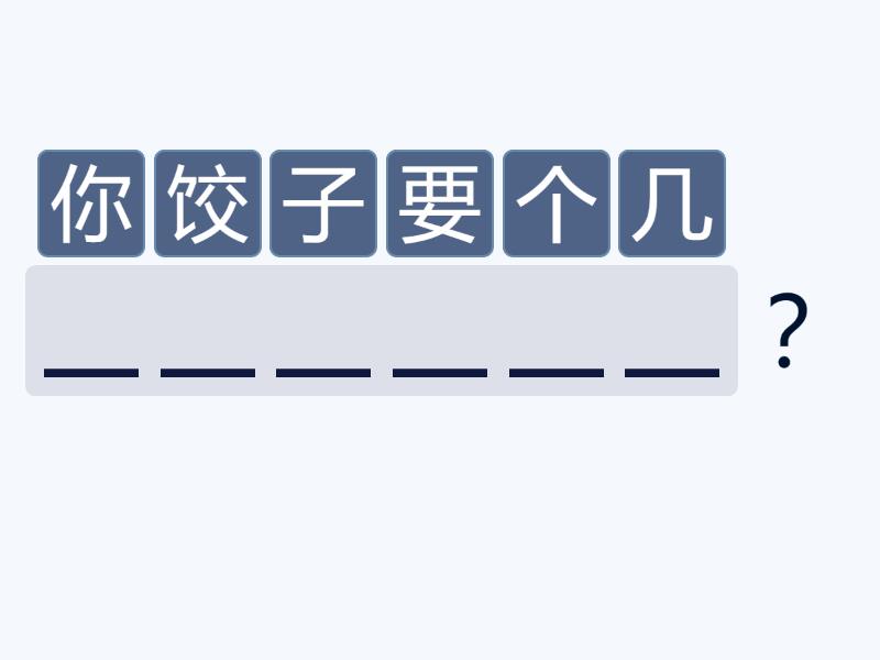 你要几个饺子?, 先生,您吃点儿什么?, 你们喝什么饮料?, 我要一碗鸡蛋汤。, 我们都喜欢吃蛋糕。, 今天是你的生日吗?, 谢谢你,我不要饮料。,