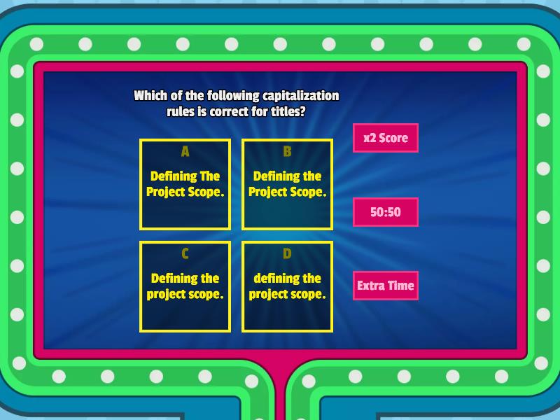 1) Which of the following capitalization rules is correct for titles? a) Defining The Project Scope. b) Defining the Project Scope. c) Defining the project scope. d) defining the project scope. 2) Which sentence correctly uses i.e.? a) The project is about marketing campaigns, i.e., social media and reels. b) The project is about marketing campaigns, i.e., it focuses only on reels.