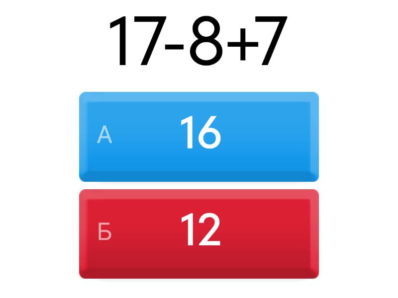1) 17-8+7 a) 16 b) 12 2) 12-3+6 a) 16 b) 15 3) 11-7+8 a) 12 b) 10 4) 12-8+7 a) 11 b) 13 5) 15-9+4 a) 10 b) 19 6) 14-7+2 a) 9 b) 4 7) 12=7+ a) 5 b) 7 8) 14=6+ a) 7 b) 8 9) 15=9+ a) 6 b) 5 10) 16=9+ a) 7 b) 5