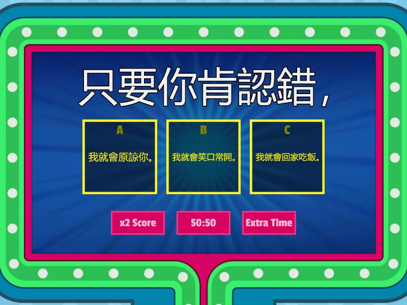 1) 只要你肯認錯, a) 我就會原諒你。 b) 我就會笑口常開。 c) 我就會回家吃飯。 2) 只要爸爸的病情有好轉, a) 弟弟就要努力讀書。 b) 媽媽就會放心下來。 c) 我就會穿運動服上學。 3) 只要弟弟繼續鍛鍊自己, a) 就會輸掉比賽。 b) 就要準時上學。 c) 就有機會勝出這屆數學比賽。 4) 只要多做運動, a) 就會容易生病。 b) 身體就會變得強壯。 c) 小鳥就會在樹上築巢。 5) 只要明天不下雨, a) 我就會做個好孩子。 b) 我就會多吃蔬菜。 c) 爸爸媽媽就會和我到海洋公園遊玩。