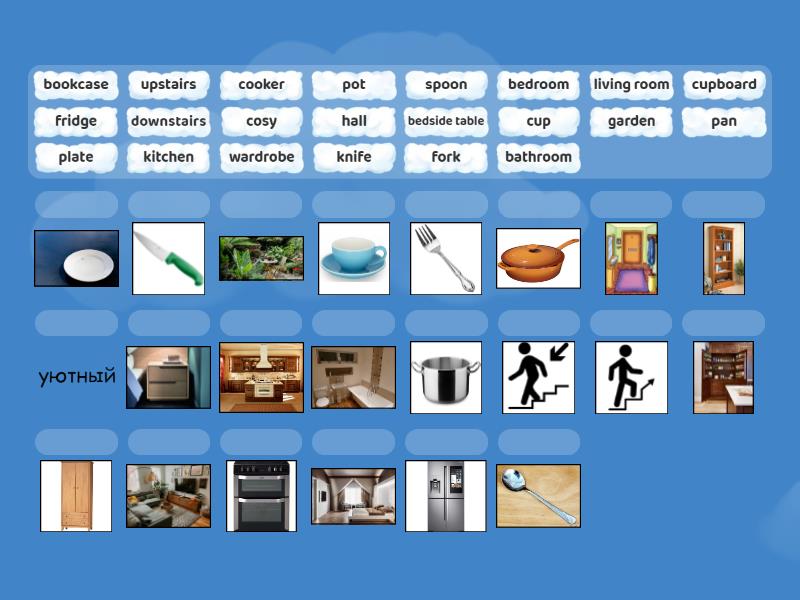 bathroom, bedroom, bookcase, cooker, cosy - уютный, cup, cupboard, downstairs, fork, fridge, garden, hall, kitchen, knife, living room, pan, plate, pot, spoon, upstairs, wardrobe, bedside table,
