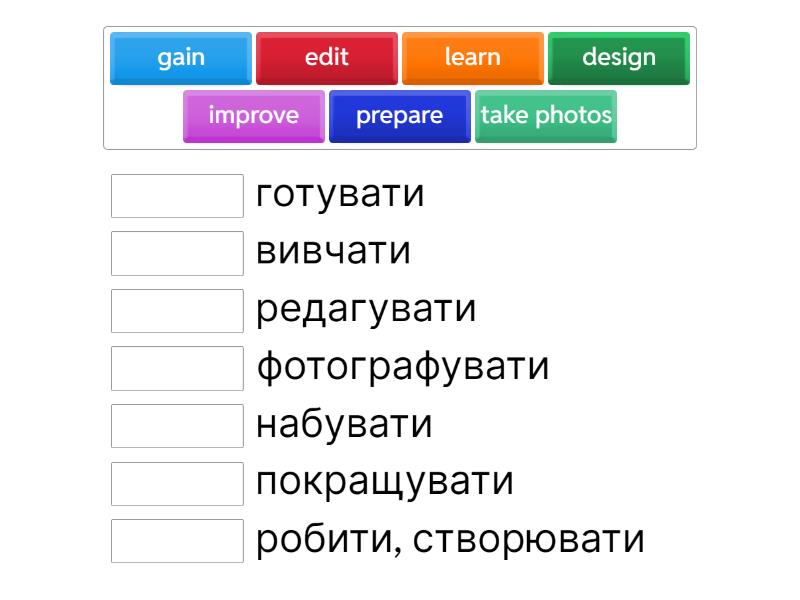 design - робити, створювати, improve - покращувати, gain - набувати, prepare - готувати, learn - вивчати, take photos - фотографувати, edit - редагувати,