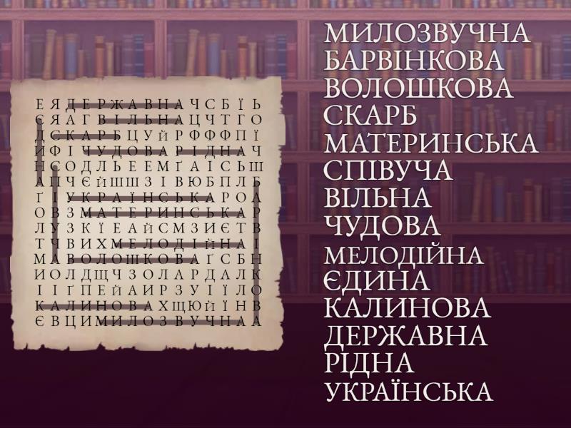 МИЛОЗВУЧНА, БАРВІНКОВА, ВОЛОШКОВА, СКАРБ, МАТЕРИНСЬКА, СПІВУЧА, ВІЛЬНА, ЧУДОВА, МЕЛОДІЙНА, ЄДИНА, КАЛИНОВА, ДЕРЖАВНА, РІДНА, УКРАЇНСЬКА,