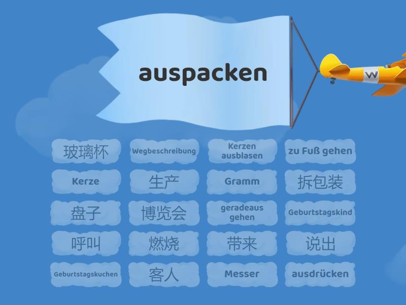拆包装 - auspacken, Kerzen ausblasen - 吹灭蜡烛, 燃烧 - brennen, geradeaus gehen - 一直走, 呼叫 - rufen, 带来 - bringen, zu Fuß gehen - 步行, 生产 - produzieren / herstellen, ausdrücken - 表达, 博览会 - Messe, Wegbeschreibung - 路线描述, Gramm - 克, Messer - 刀, 玻璃杯 - Glas, 盘子 - Teller, Geburtstagskuchen - 生日蛋糕, Kerze - 蜡烛, Geburtstagskind - 寿星, 客人 - Gast, 说出 - aussprechen / sagen,