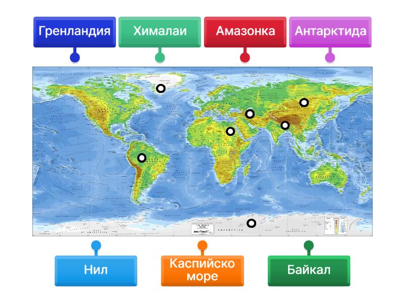 Нил, Амазонка, Каспийско море, Байкал, Антарктида, Гренландия, Хималаи.