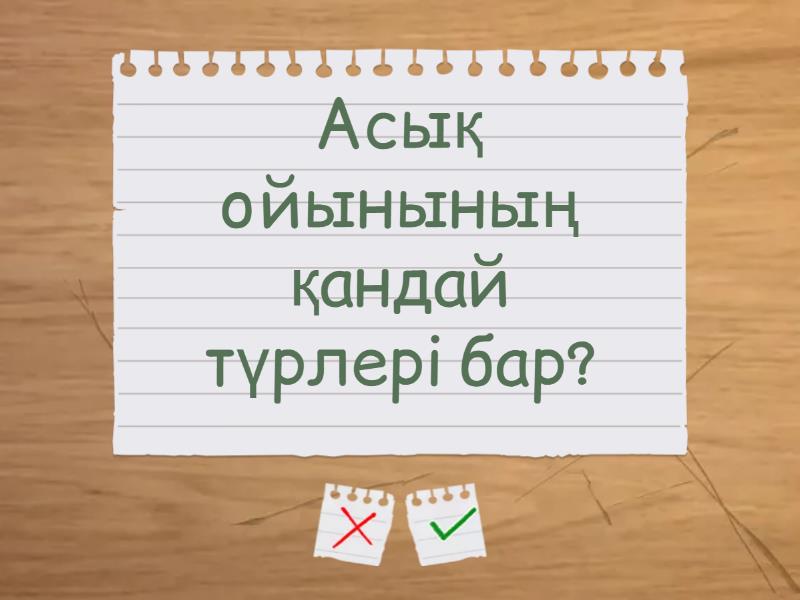 Баскеобол ойынының ағылшын тіліндегі мағынасы қандай? - basket-себет,ball-доп, Гандбол ойынының ұзақтығы қанша және қанша таймнан тұрады? - ойын ұзақтығы 30минут,2таймнан тұрады, Асық ойынының қандай түрлері бар? - құмар,тәйке,алшы,омпы және т.б, Қандай қазақ ұлттық ойындарын білесің? - Көкпар,тоғызқұмалақ,ақсүйек,бас тас,ләңгі т.б, Волейболл ойынын алғаш ойлап тапқан кім? - У.Д.Морган,