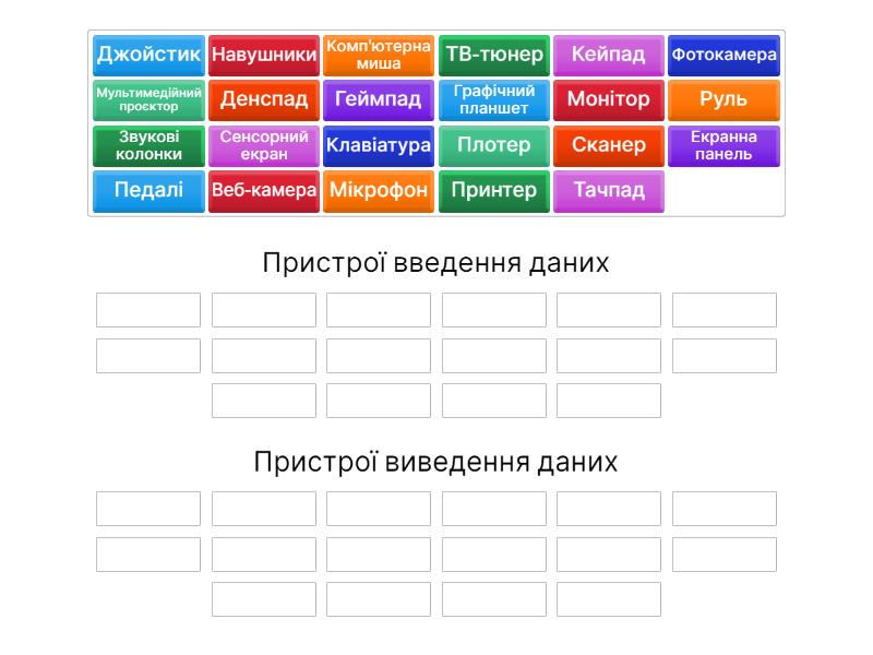 Пристрої введення даних: Клавіатура, Комп'ютерна миша, Сканер, Фотокамера, Графічний планшет, Мікрофон, Веб-камера, ТВ-тюнер, Тачпад, Сенсорний екран, Джойстик, Геймпад, Педалі, Руль, Денспад, Кейпад, Пристрої виведення даних: Монітор, Принтер, Плотер, Навушники, Звукові колонки, Мультимедійний проєктор, Екранна панель,