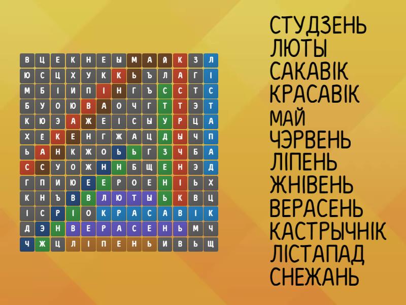СТУДЗЕНЬ, ЛЮТЫ, САКАВІК, КРАСАВІК, МАЙ, ЧЭРВЕНЬ, ЛІПЕНЬ, ЖНІВЕНЬ, ВЕРАСЕНЬ, КАСТРЫЧНІК, ЛІСТАПАД, СНЕЖАНЬ,