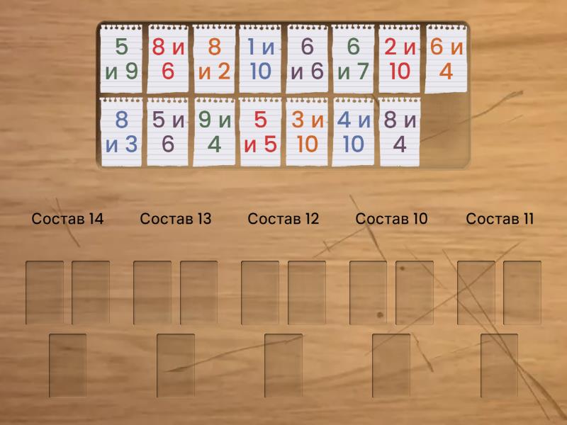 Состав 14: 8 и 6, 5 и 9, 4 и 10, Состав 13: 3 и 10, 6 и 7, 9 и 4, Состав 12: 6 и 6, 8 и 4, 2 и 10, Состав 10: 5 и 5, 8 и 2, 6 и 4, Состав 11: 5 и 6, 1 и 10, 8 и 3,