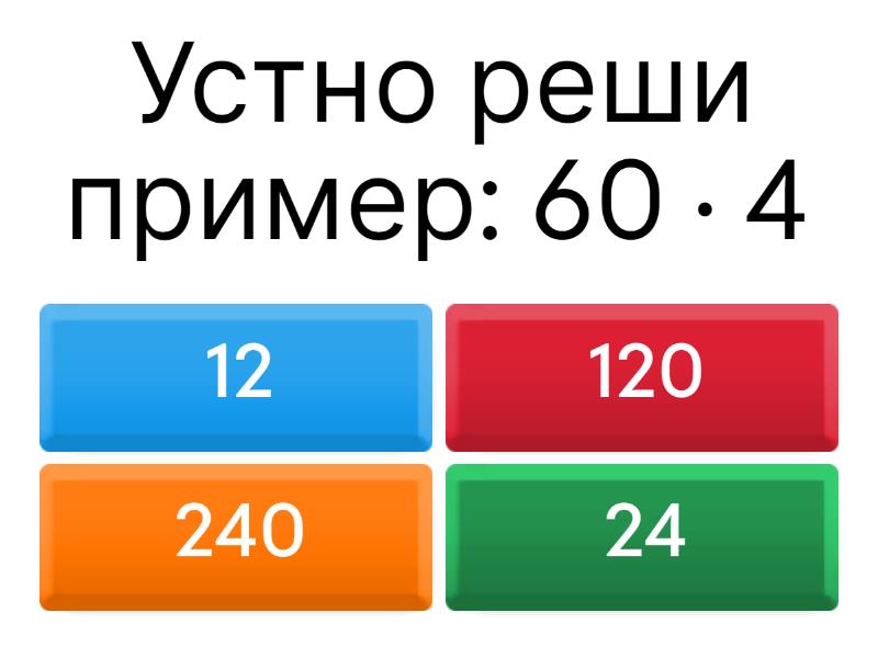 1) Устно реши пример: 60 · 4 a) 12 b) 120 c) 240 d) 24 2) Устно реши пример: 80 : 2 a) 40 b) 4 c) 16 d) 6 3) Представьте числа в виде суммы разрядных слагаемых: 566 a) 500 + 50 + 16 b) 550 + 16 c) 500 + 60 + 6 d) 500 + 60 + 5 4) Представьте числа в виде суммы разрядных слагаемых: 103 a) 100 + 3 + 0 b) 10 + 3 + 90 c) 100 + 10 + 3 d) 100 + 2 + 1 5) Устно реши пример: 90 : 3 a) 30 b) 3 c) 2 d) 9
