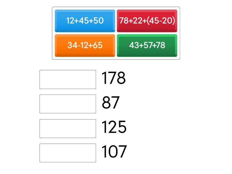 12+45+50 - 107, 78+22+(45-20) - 125, 34-12+65 - 87, 43+57+78 - 178,