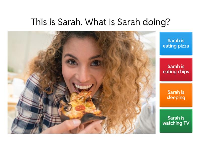 1) This is Sarah. What is Sarah doing? a) Sarah is eating pizza b) Sarah is eating chips c) Sarah is sleeping  d) Sarah is watching TV 2) What are the children doing? a)  The children are playing soccer b) They're planting c) They're playing d) He's planting 3) True or False: I'm not studying math now. a) True b) False 4) What is he doing? a) He's washing dishes  b) He is washing his car c) He is cheking his e-mails d) He washing his car 5) What is she doing?  a) She playing with her son b) She drinking water  c) She drinking wine  d) She drinking tea  6) What am I doing? a) I'm writing b) I am coking c) I am washing dishes d) I am writing a letter 7) What are the dog and the little girl doing? a) They are sleeping b) The dog is eating and the girl is sleeping c) They're drinking water d) They're cooking 8) Am I studying or reading a book? a) You are studying b) You are reading a book 9) True or False: The little boy is crying a) True b) False 10) True or False: He isn't taking pictures a) True b) False