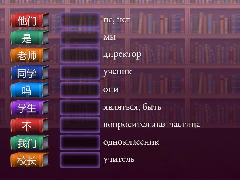 同学 - одноклассник, 学生 - ученик, 是 - являться, быть, 不 - не, нет, 我们 - мы, 他们 - они, 老师 - учитель, 校长 - директор, 吗 - вопросительная частица,
