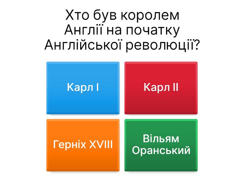 1) Хто був королем Англії на початку Англійської революції? a) Карл I b) Карл ІІ c) Герніх XVIII d) Вільям Оранський 2) Яка подія стала початком Англійської революції 1642 року? a) Страта короля Карла I b) Битва при Нейзбі c) Напад на парламент за наказом короля d) Підписання "Білля прав" 3) Що стало результатом Великої революції в Англії 1642-1651 років? a) Англія стала республікою b) Англія стала частиною Франції c) Англія залишилася монархією d) Англія стала демократичною федерацією 4) Хто очолив армію парламентаріїв під час Англійської революції? a) Олівер Кромвель b) Джеймс II c) Карл II d) Віоьям Оранський 5) Яка була основна причина конфлікту між королем Карлом I та парламентом? a) Суперечки щодо податків і монархічної влади b) Територіальні суперечки з іншими країнами c) релігійні реформи d) економічні проблеми 6) Що сталося після страти короля Карла I в 1649 році? a) Англія стала республікою b) Англія відновила монархію c) Англія об'єдналася з Шотландією d) Англія приєдналася до Франції 7) Хто став лордом-протектором після страти Карла I? a) Олівер Кромвель b) Джеймс II c) Карл II d) Річард Кромвель 8) Яка роль Олівера Кромвеля під час революції? a) Лідер парламентаріїв і військовий командувач b) Король Англії c) Генерал королівських військ d) Релігійний лідер 9) Що сталося після реставрації монархії в 1660 році? a) Король Карл II повернувся на трон b) Англія стала республікою c) Англія відновила парламентську демократію d) Влада була передана парламенту 10) Хто були індепенданти під час Англійської революції? a) Прихильники монархії b) Радикальна фракція парламенту, яка виступала за республіку c) прихильники католицизму d) прихильники Олівера Кромвеля 11) Що було основною метою індепендантів під час Англійської революції? a) Відновлення абсолютної монархії b) Збереження парламентської монархії c) Встановлення республіки з радикальними змінами d) Підтримка католицизму 12) Коли відбулася Славна революція в Англії? a) 1649 р. b) 1660 c) 1688 d) 1670 13) Хто став королем Англії після Славної революції? a) Карл II b) Карл І c) Олівер Кромвель d) Вільям Оранськмй 14) Що було наслідком Славної революції 1688 року? a) Відновлення абсолютної монархії в Англії b) Підписання "Білля прав", обмеження влади монарха c) Початок республіканського правління в Англії d) Розпуск парламенту 15) Які права були підтверджені після Славної революції? a) Безумовна підтримка монархії та католицизму b) Право парламенту на контроль над податками і військовими силами c) Абсолютна свобода слова для монарха d) Скасування парламенту і встановлення одноосібної влади короля