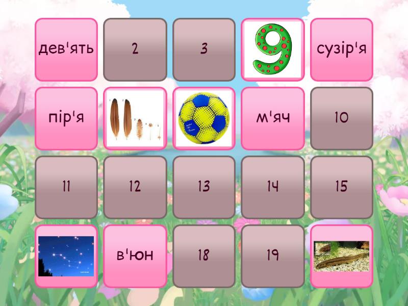 м'яч, пір'я, дев'ять, сузір'я, в'юн, хом'як, м'ята, м'ясо, п'ять, сім'я,