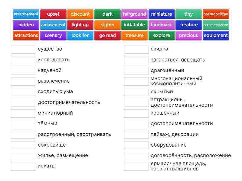 look for - искать, dark - тёмный, go mad - сходить с ума, creature - существо, hidden - скрытый, amusement - развлечение, landmark - достопримечательность, attractions - аттракционы, достопримечательности, miniature - миниатюрный, fairground - ярмарочная площадь, парк аттракционов, light up - загораться, освещать, upset - расстроенный, расстраивать, explore - исследовать, arrangement - договорённость, расположение, accommodation - жильё, размещение, precious - драгоценный, cosmopolitan - многонациональный, космополитичный, sights - достопримечательности, equipment - оборудование, scenery - пейзаж, декорации, treasure - сокровище, inflatable - надувной, discount - скидка, tiny - крошечный,